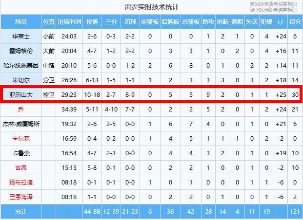 雷霆:亚历山大30分5板9助2断、乔21分2板5助2断、米切尔14分3板3助3断、哈尔滕施泰因11分8板、霍姆格伦11分3板1助2帽、卡鲁索10分4板3助2断、吉昂10分2板1助、杰林·威廉姆斯6分7板4助