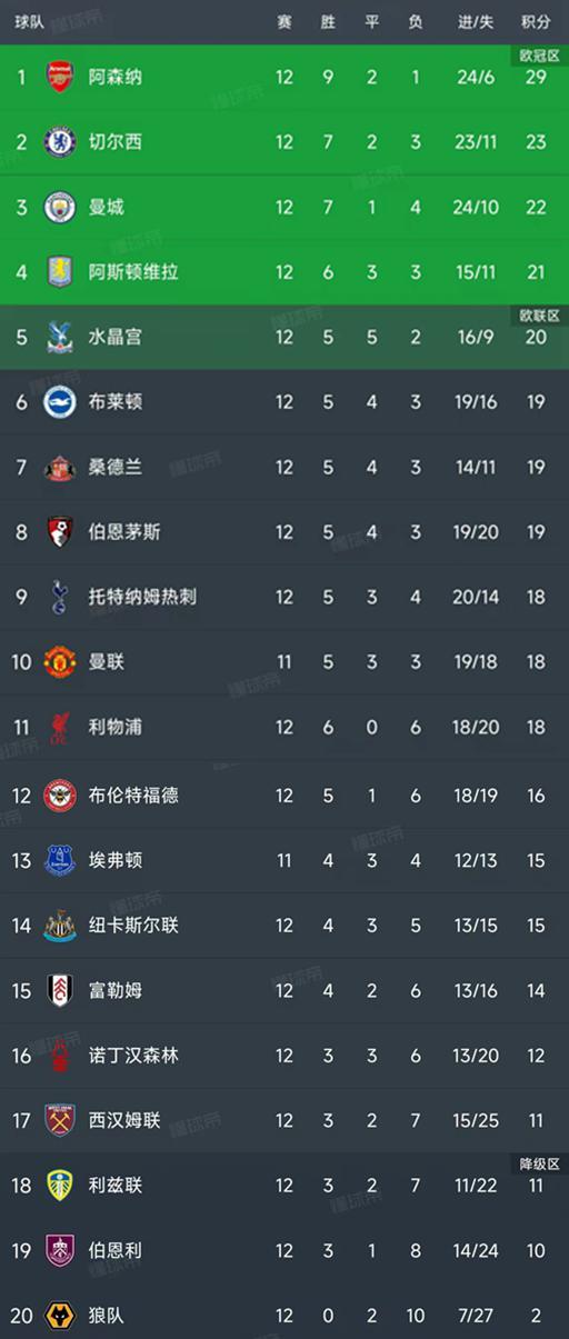 北京时间11月24日,英超第12轮结束了9场比赛 ,最新积分榜如下!